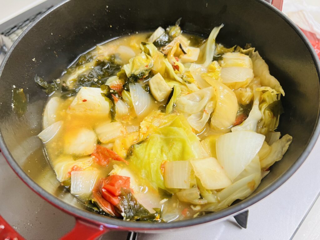 わかめ、お好きなきのこ、トマト、キャベツ、玉ねぎ、キムチ、生姜、みその順番に入れていきます。