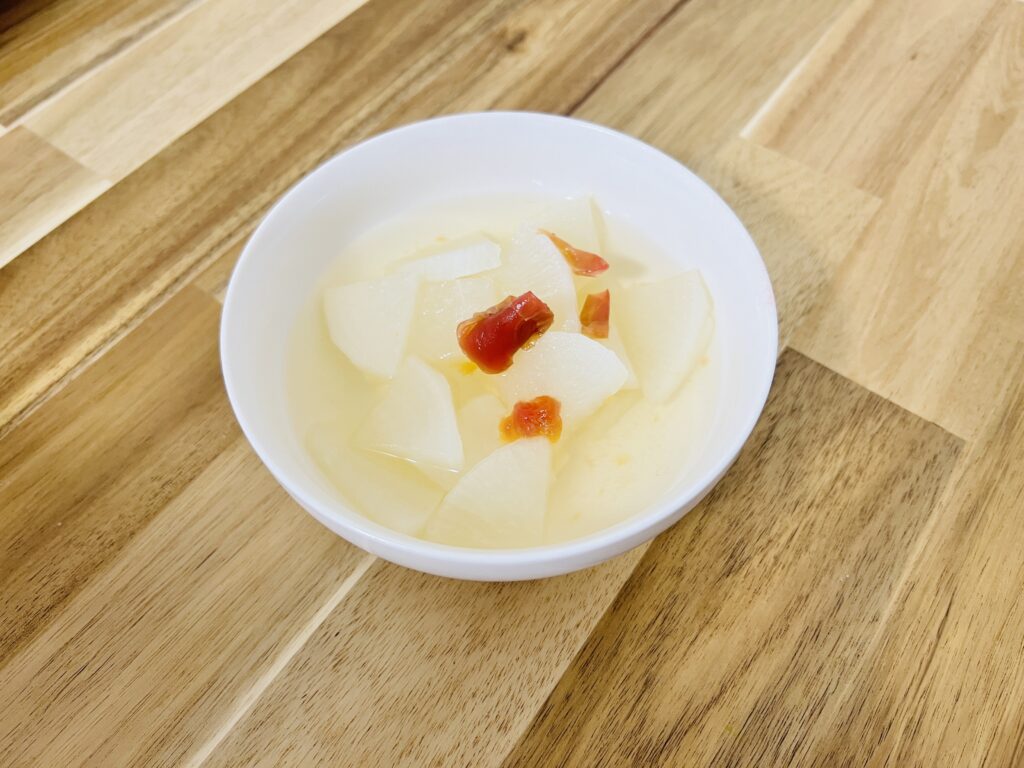 ③②で作ったハチミツリンゴ酢に大根を入れて2-3時間漬けたら完成!