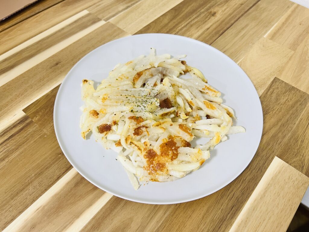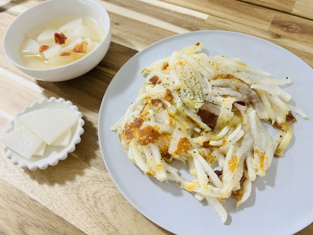 あっさりレシピが続いたので、3品目はおやつにもおかずにもぴったりのハッシュド大根です!